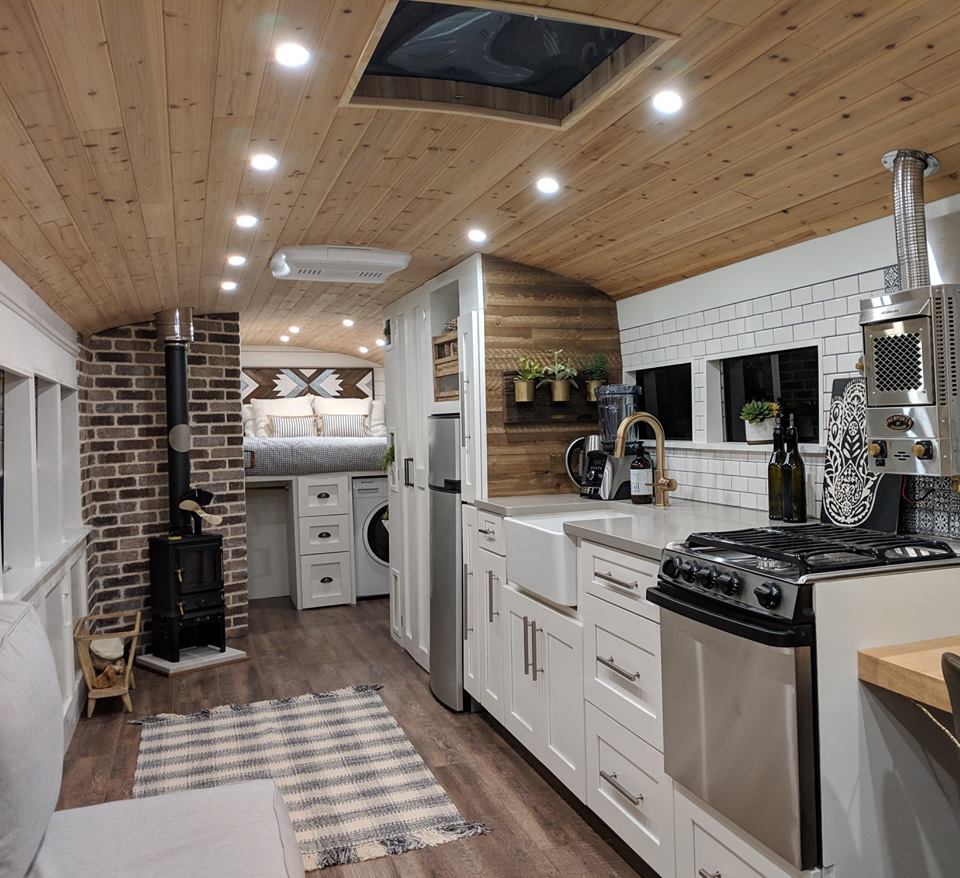 - The bus has an open floor plan and is equipped with a full bed, full-size kitchen, and a full bathroom complete with shower.