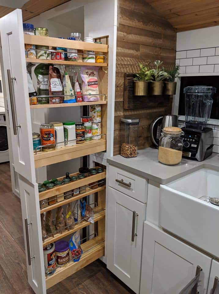 There’s a pull-out pantry, quartz countertops, and a farmhouse sink.