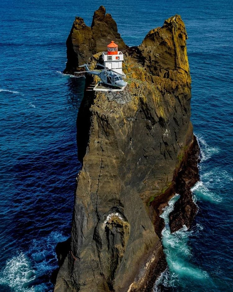 The rocky cliff where the lighthouse built is located off the coast of the Westman Islands.