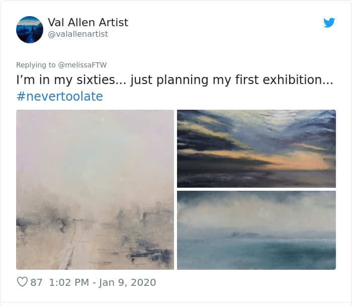 Check out some of the most inspiring middle-age success tweets and may we all realize that, yes, it’s never too late to chase our dreams.