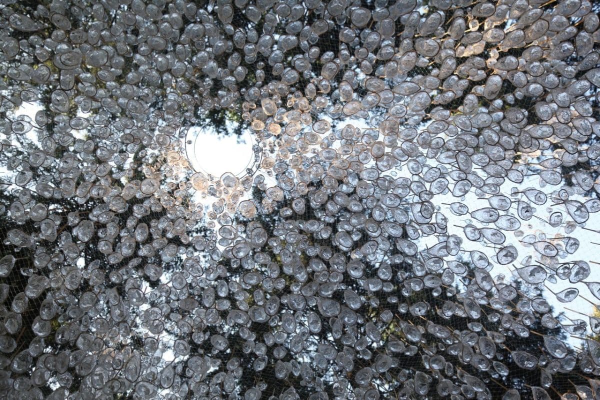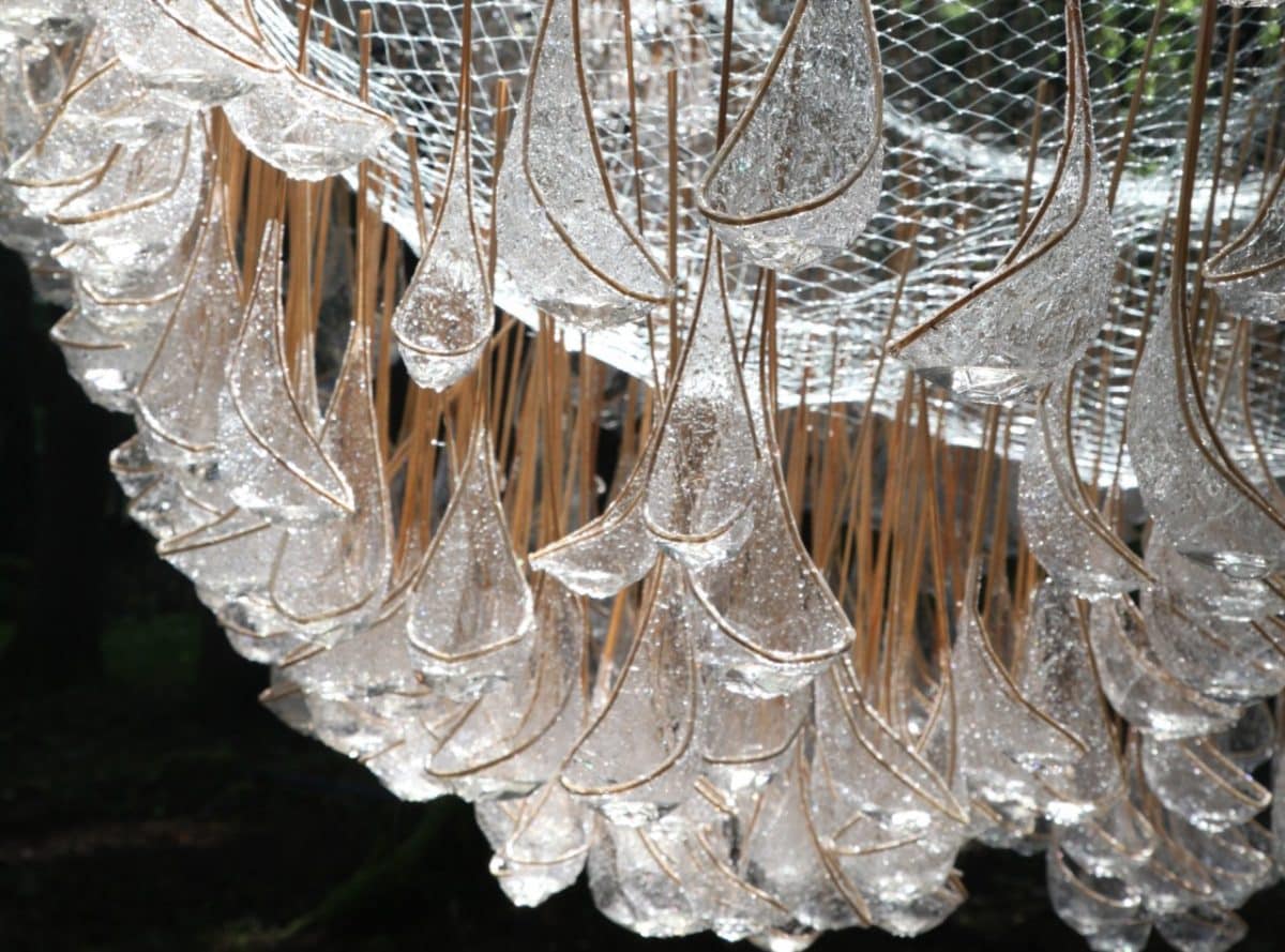 I was initially worried that birds might accidentally fly into the net structure and get caught and hurt. So we did tests with different types of netting and by using a very fine net we have had no problems with birds or any other type of animals. I think the shine of the droplet parts also repels birds from flying into the sculpture.”