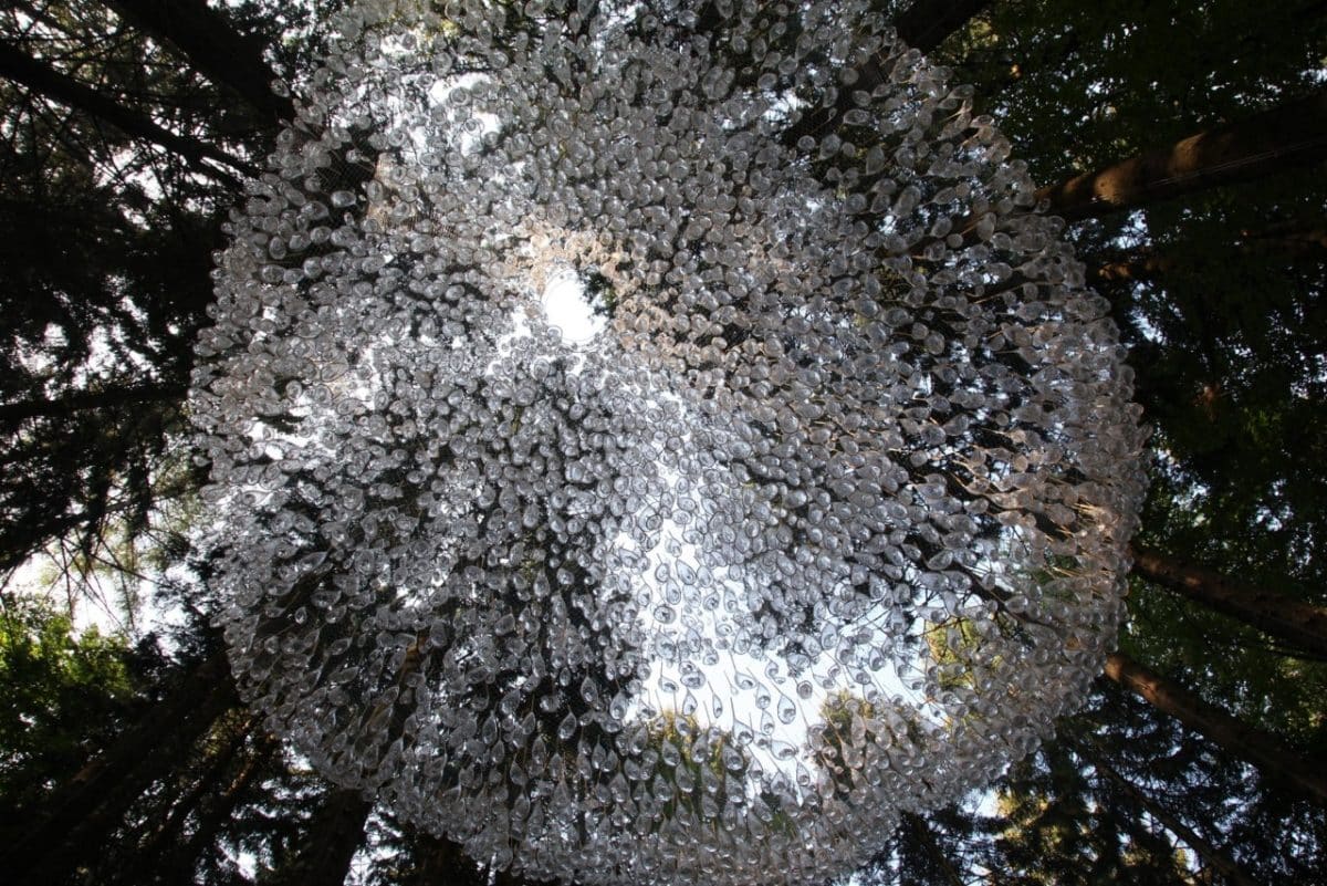 Situated in a clearing within an Italian forest, John Grade’s latest installation appears like a chandelier glistening among the pine trees. Reservoir is featured in the Arte Sella Sculpture Park in Borgo Valsugana and is made up of five thousand clear droplets each of which is delicately attached to translucent nets, supported by tree trunks.