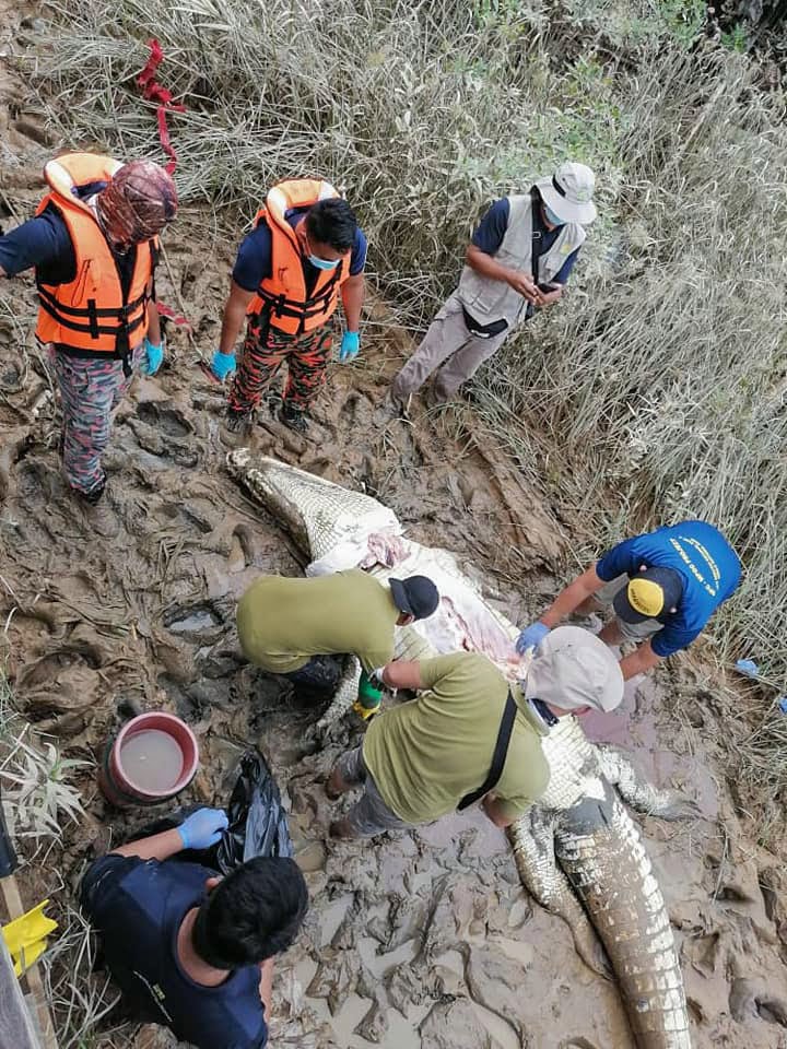 “The crocodile was pulled onto the shore where its stomach was checked, “ the spokesman added.
