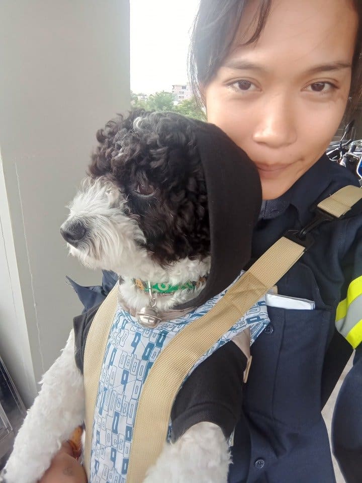 Amazingly, the adorable dog remains calm throughout Thitirat’s entire shift.