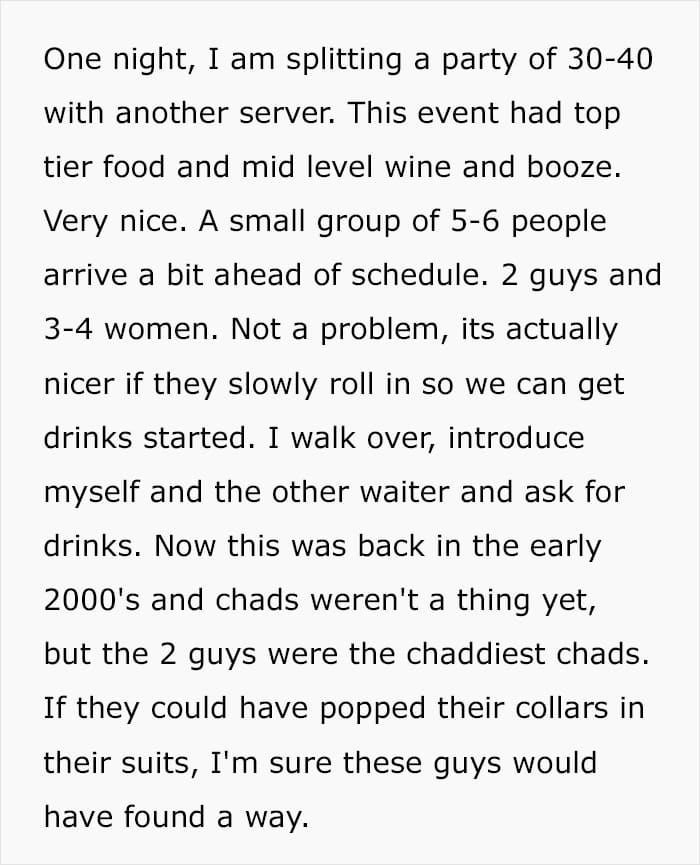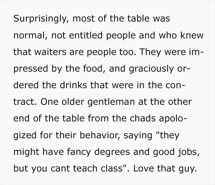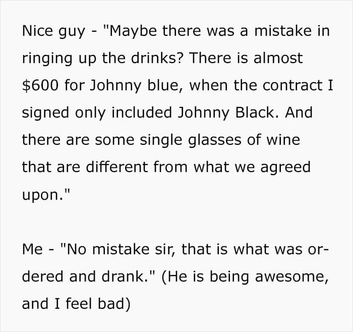 The story was shared on the internet by an anonymous waiter who had to deal with the conceited men that were attending a company dinner at a fancy restaurant. The waiter revealed that although the boss had already chosen the food and drinks for the party, the two men insisted on ordering some expensive liquor. In addition to that, they complained about the food that was served and was rude to the waitstaff. Not surprisingly, karma would soon come for the jerks.