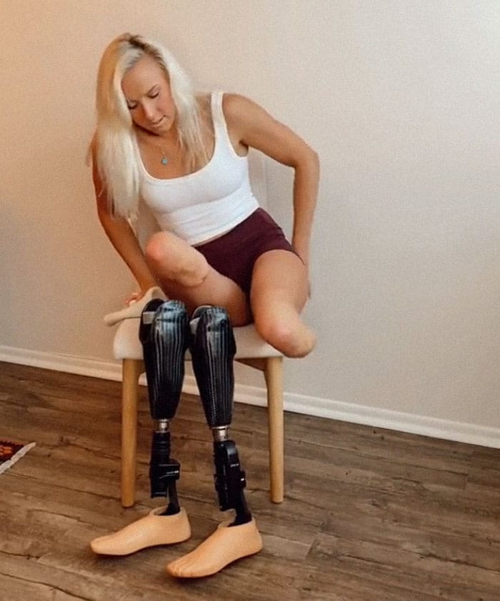 - A double amputee born with fibular hemimelia, she uses prosthetic legs.
