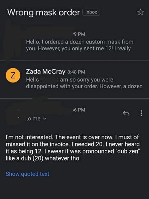 Customer Orders A Dozen Masks, Gets Mad After Receiving “Only 12”